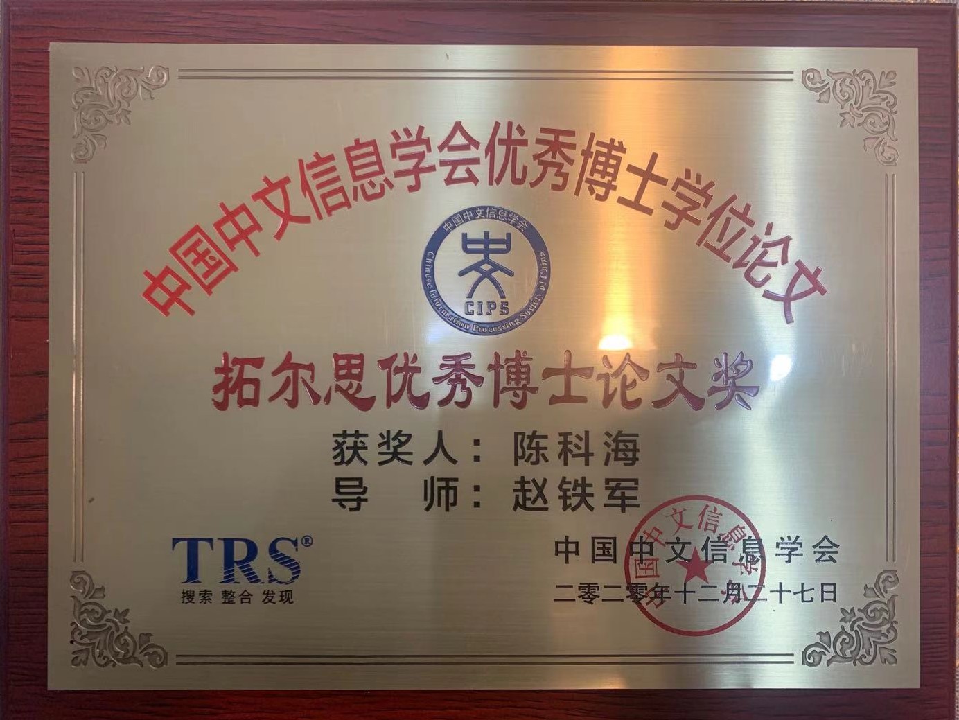 中国中文信息学会"优秀博士学位论文奖"由北京拓尔思信息技术股份有限公司捐资设立,旨在鼓励中文信息处理领域的博士研究生在读博期间面向前沿方向、立足原始创新、开拓进取,勇创世界领先的研究成果。今年,中国中文信息学会"优秀博士学位论文奖"在全国范围内共评选出优秀博士学位论文奖获得者5名。其中,公司2010届软件工程专业毕业生陈科海获此殊荣,他的获奖博士论文题目为《机器翻译上下文表示方法研究》,指导教师是哈尔滨工业大学赵铁军教授。