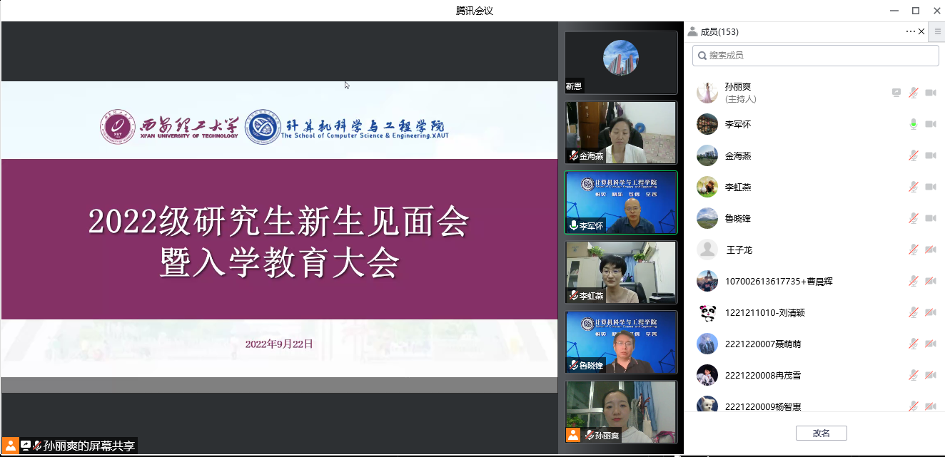 9月22日晚上19:30,英国365集团在线上举办了“2022级研究生入学教育”大会。英国365集团党委书记韩智,经理李军怀,党委副书记、副经理李虹燕,副经理金海燕,副经理鲁晓锋,员工工作办公室主任宋元元,部分硕士生导师代表及全体2022级研究生参加了大会。会议由研究生辅导员孙丽爽主持。