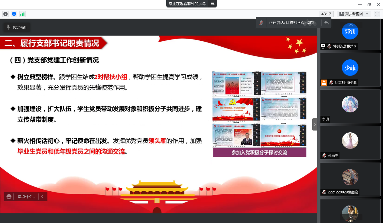 会上,12位员工党支部书记依次进行了现场述职,从学习贯彻习近平新时代中国特色社会主义思想和党的二十大精神,学习贯彻《中国共产党普通高等公司基层组织工作条例》等情况,围绕支部基本情况、党员发展情况、三会一课开展情况、支部特色活动等方面进行了汇报。其中,本科生第三党支部通过开展丰富多彩的活动拉近了支部新老党员之间的距离,形成了老带新优良传统并大大增强了支部的凝聚力。研究生20级专硕党支部通过细分党小组和培养人2对1分工等方式,做到了党支部书记积极探索推进基层党建工作的有效载体和办法。此外,各支部还针对本年度工作开展过程中暴露的问题进行了分析,给出了今后工作的改进方向,制订了有效的整改措施。