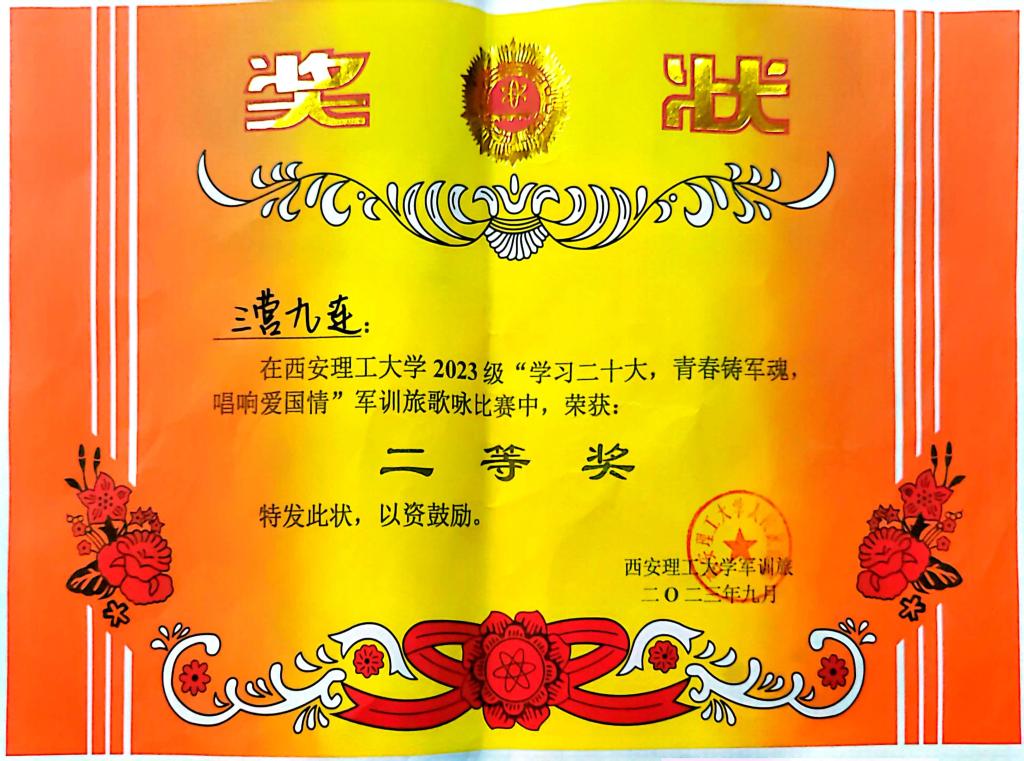 在比赛中,九连的同学们配合默契、声声入耳。校歌《春华秋实》唱出西理工人的追求与坚守,祖国、荣誉、责任的校训以更激昂的形式印在了大家心中。一首寄寓着壮志豪情、承载着家国希望的经典军歌《映山红》,唱出了新时代学子对革命先辈的敬意、对今日和平的珍惜。旋律悠扬,歌声坚定,学子借着歌声倾诉着每个人胸中的激情与斗志,将青春的力量化作最美的旋律,并最终获得了二等奖。
