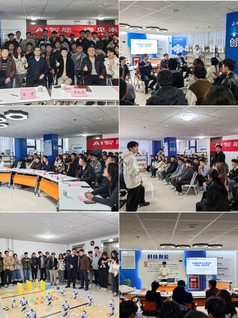 活动现场,软件工程系副主任傅博和机器人研发团队介绍了鲁班机器人的成长历程、户外自动驾驶机器人的现实应用、机器人大赛对员工能力素质提升的影响力等情况,并进行了机器人团体舞蹈的现场展演。同学们围绕机器人的发展、人工智能的应用、新科技对计算机行业的影响、就业状况对本科生能力素质的新要求等方面,与老师和机器人团队成员进行了交流互动。