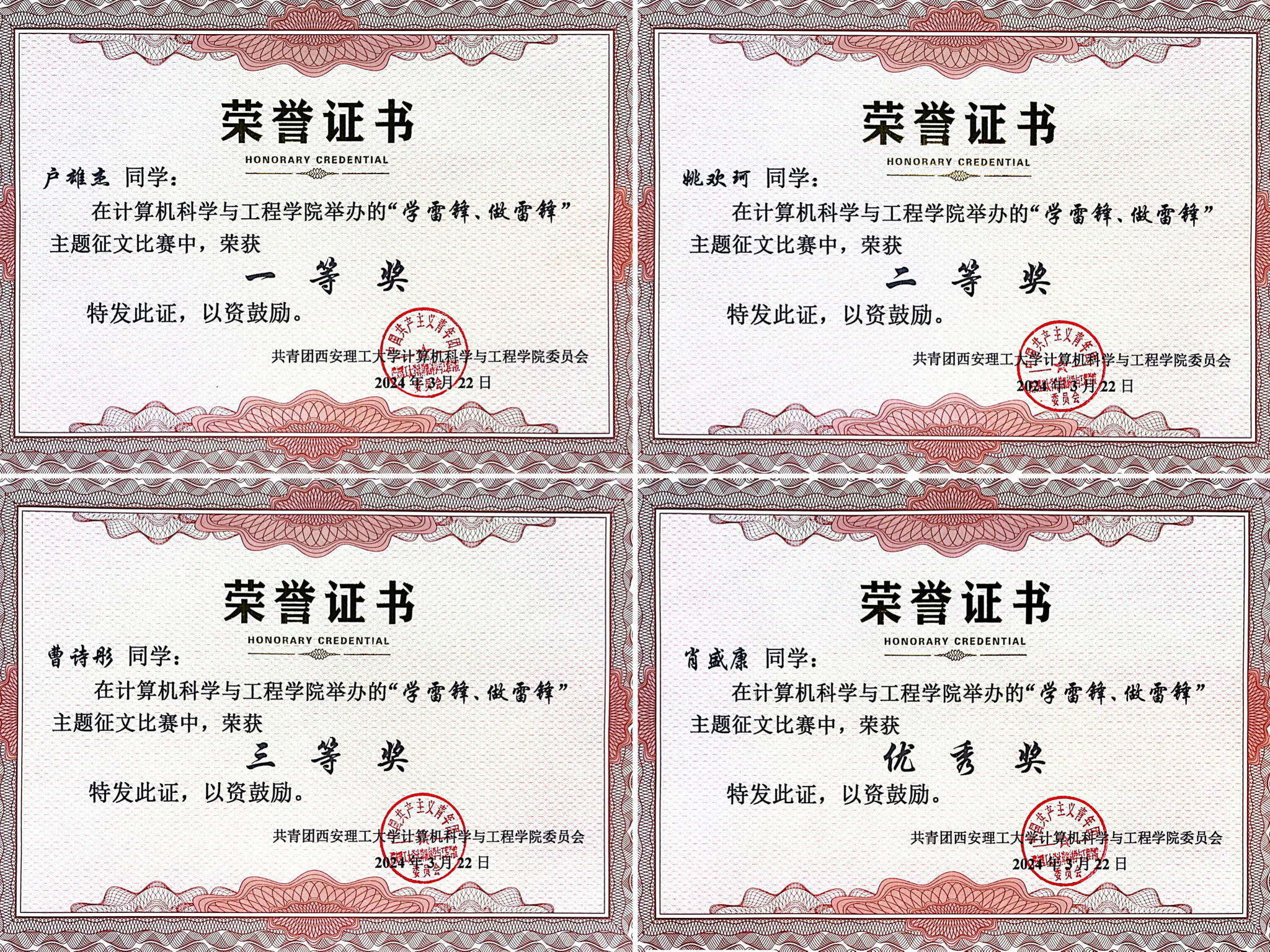 同学们积极响应,征文内容围绕雷锋精神的核心价值,鼓励员工结合自身经历和感受,撰写关于如何在日常生活中践行雷锋精神、如何在学习工作中体现奉献精神的文章。经评委老师仔细评阅和严格打分,最终推选出一等奖1篇,获奖员工为物网232户雄杰;二等奖2篇,获奖员工为软件232姚欢珂、人智231雷晓珍;三等奖3篇,获奖员工为物网231班曹诗彤、计234杨佳怡、计233白佳庆;优秀奖3篇,获奖员工为人智231曹雨欣、计231王卓、网络231肖盛康。