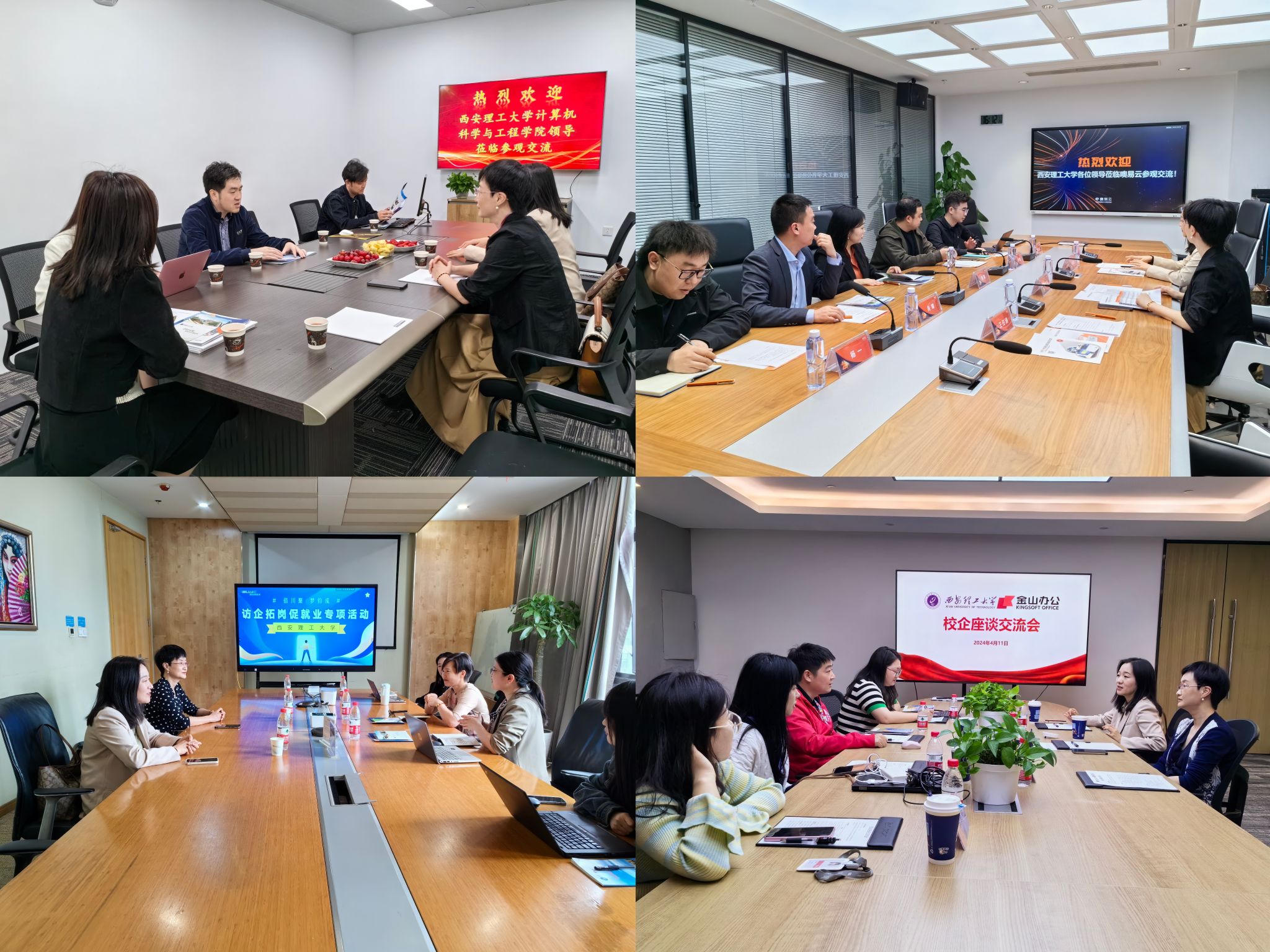 参观结束后李虹燕一行与各企业举办了交流座谈会。座谈会上,各企业负责人介绍了校招情况与人才培养体系,并针对空缺岗位工作要求与福利待遇做了详细说明,同时表示理工大学子都具备较强的工作学习能力,不少毕业生已成为业务骨干,希望能与公司就协同育人,就业育人展开进一步合作。李虹燕向各企业对于理工大学子的肯定表示感谢,并详细介绍了公司的办学特色、培养计划、科技竞赛、产教融合等情况,解析本科与硕士毕业班的员工特点与优势,同时期待院企双方全方位深层次开展交流合作,促进员工高质量充分就业,企业高质量快速发展。随后院企双方负责人就生产实践训练、学科竞赛指导、信创人才培养、前沿技术分享等方面深入交换了意见并达成初步合作意向。