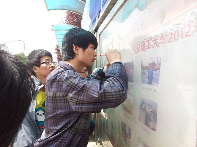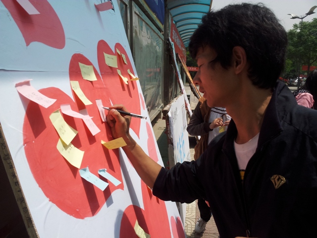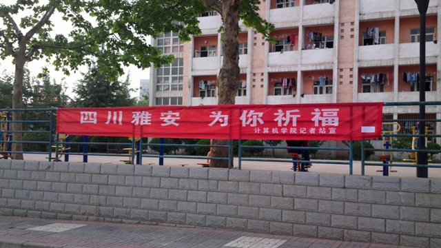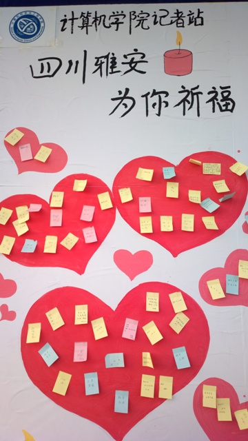 4月20日四川省雅安市芦山县发生7.0级强烈地震。虽然作为在校老员工不能赴灾区参与救援,但是他们可以表达对逝者沉痛的哀悼和对生者真诚的祝福。4月24日中午12时,计算机公司记者站在曲江校区举行了“雅安祈福•爱心留言”活动。