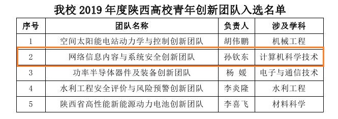 4月15日,陕西省教育厅公布了2019年度陕西高校青年创新团队入选名单,公司孙钦东教授牵头的“网络信息内容与系统安全创新团队”成功入选。 本次陕西高校青年创新团队评选工作是省教育厅首次启动。经过高校遴选推荐、教育厅组织材料形式审查、专家评审、厅务会审议和网上公示等环节,最终公司共有5个团队入选。