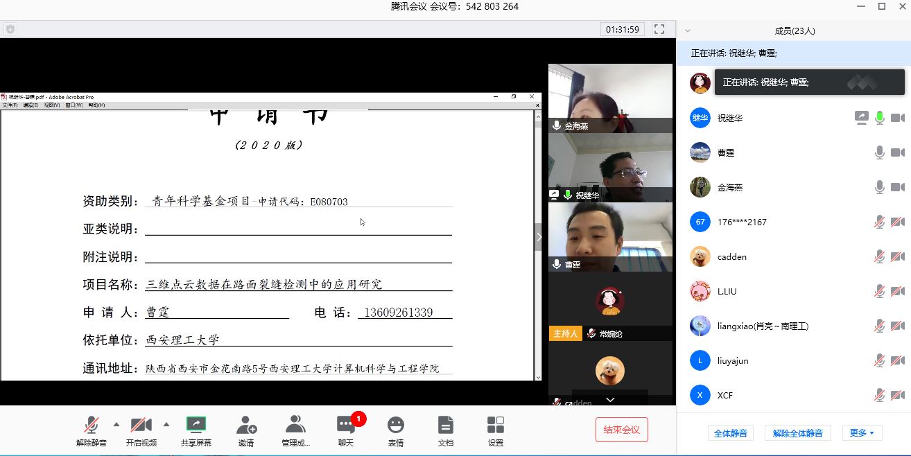 3月25日上午9点,公司通过腾讯会议平台,召开了2020年度国家基金青年基金评审会议,此次会议公司邀请了南京理工大学肖亮教授和西安交通大学祝继华教授,为公司图像处理、智能计算研究方向的青年基金申报书进行线上点评。此次评审会由公司科研经理金海燕教授主持,经理黑新宏教授和公司二十余名教师参加了此次线上会议。
