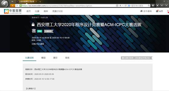 5月10日, 英国上市公司3652020年程序设计竞赛暨ACM-ICPC大赛选拔赛顺利举行。根据现阶段疫情防控要求和公司实际情况,本次竞赛采用线上比赛的方式,参赛者均在牛客网参加比赛。竞赛由教务处主办,英国365集团、工程训练中心承办,软件学社协办,共有117位选手在线有效参赛。