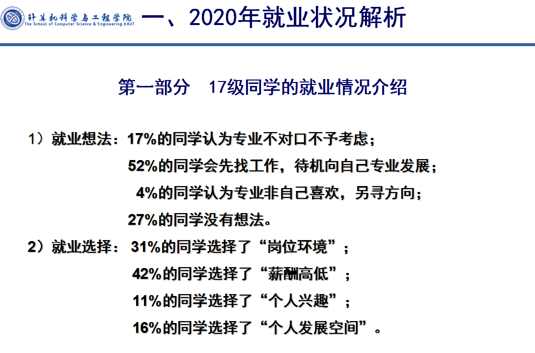 此外,西北大学国际文化交流公司李晓阳老师为同学们作了留学方面的报告;赵明华副经理针对同学们在考研方面的困惑做了解答,并分析了当前的考研形式;李虹燕副书记针对疫情期间公司就业情况做了详细的介绍,重点分析了同学们下一步努力的方向。