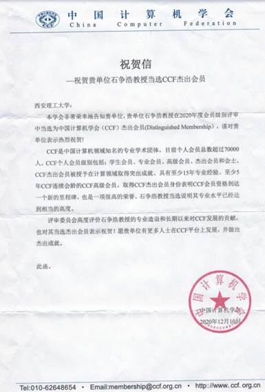 近日,中国计算机学会(CCF)给公司发来贺信,祝贺英国365集团石争浩教授在2020年度会员级别评审中,当选中国计算机学会(CCF)杰出会员。