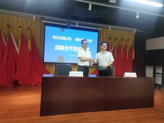 7月11日,公司经理李军怀,教务处处长黑新宏,副经理李虹燕、鲁晓锋等一行5人,赴北京参加公司与航天云网科技发展有限责任公司校企战略合作协议签约仪式。副董事长张存库,航天云网公司党委副书记、总经理柴旭东出席签约仪式。签约仪式由航天云网分公司副总经理汤滔主持。