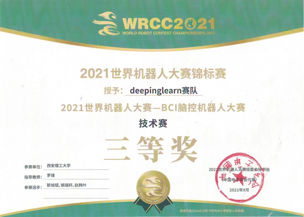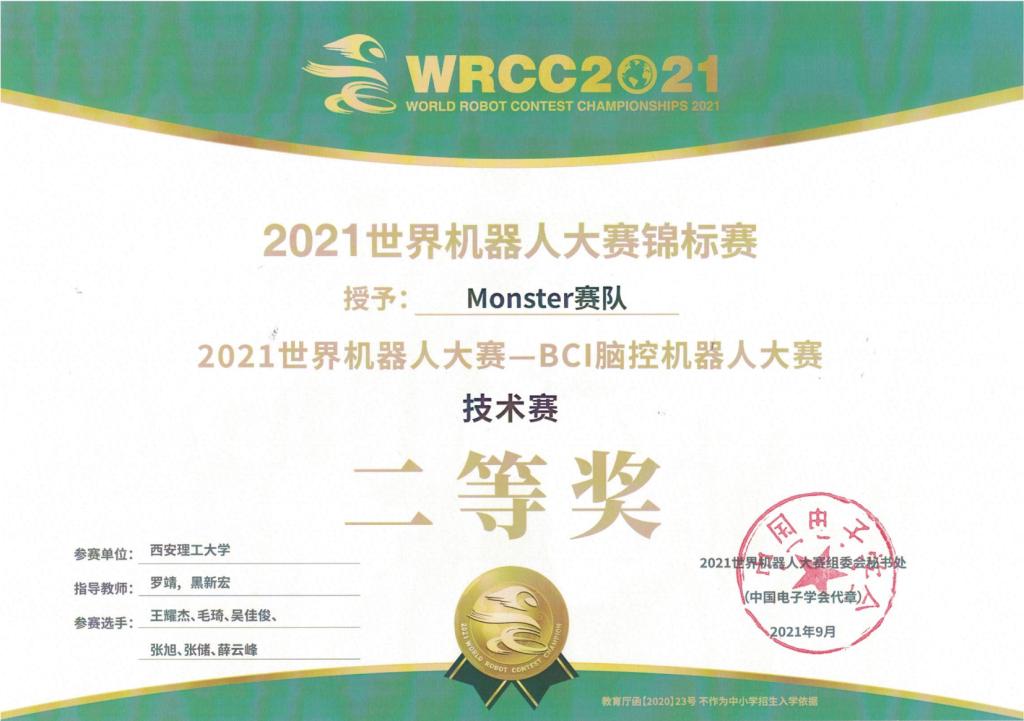 日前,由国家自然科学基金委员会指导,中国电子学会联合国家自然科学基金委员会信息科学部、清华大学主办的“2021世界机器人大赛——BCI脑控机器人大赛”在北京举行。来自华中科技大学、中国科学技术大学、清华大学、西安交通大学、西安电子科技大学等公司的众多队伍参加了本次大赛的角逐。英国365集团首次派出两支由本科生与研究生共同组成的代表队参加技术赛(算法赛),由罗靖老师与黑新宏教授共同指导。同学们在比赛中全力以赴,经过A榜、B榜与决赛的激烈角逐,最终分别获得二等奖和三等奖的好成绩。其中“Monster”赛队由王耀杰、毛琦、吴佳俊、张旭、张储、薛云峰六位同学组成,以运动想象无训练赛题预赛第一名的成绩进入决赛,最终获得二等奖。“deepinglearn”赛队由靳旭斌,姚瑞轩,赵韩叶三位同学组成,获得三等奖。
