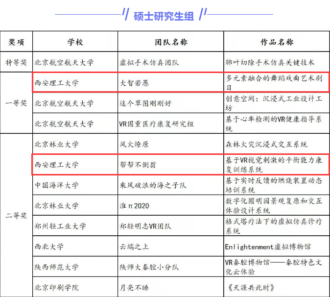 11月4日至5日,由中国产学研合作促进会指导,北京市石景山区人民政府、中国虚拟现实技术与产业创新平台等共同主办的第四届虚拟现实技术及应用创新大赛高校创新赛,因疫情原因调整为线上举行。公司李军怀、王怀军、曹霆合作指导的“多元素融合的舞蹈戏曲艺术剧目”项目团队(团队成员:杜丹丹、崔长瑞、高宇)和金海燕、肖照林合作指导的“基于VR视觉刺激的平衡能力康复训练系统”项目团队(团队成员:陈丹娜、吴国华、闫智慧、丁健行),分别获得研究生组一等奖和二等奖。