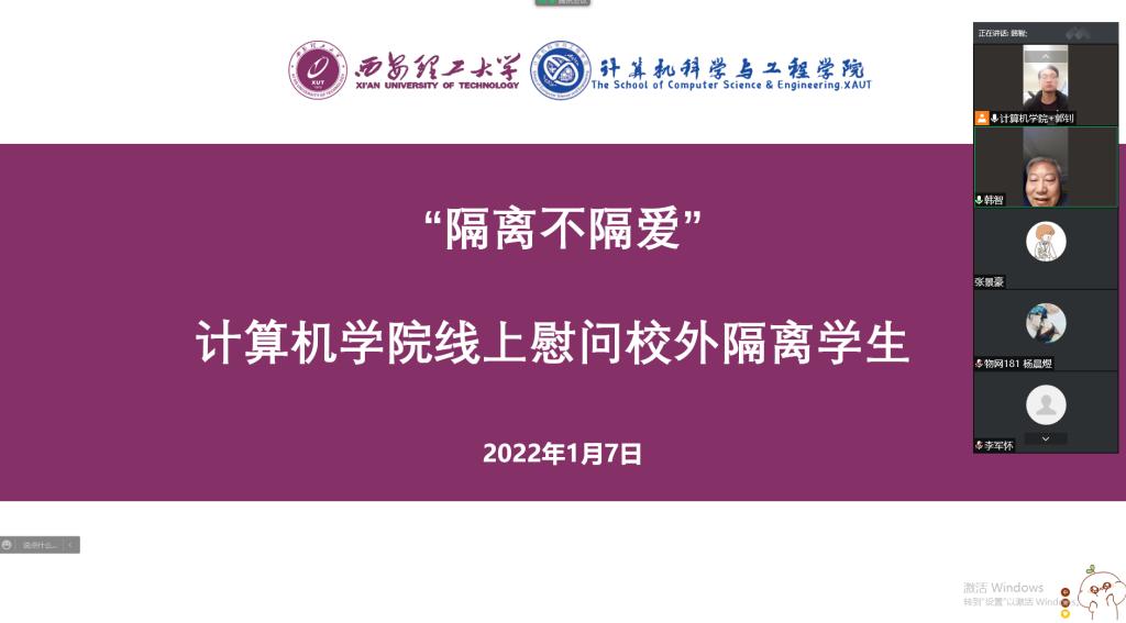1月7日晚,英国365集团党委书记韩智、经理李军怀、副书记李虹燕、辅导员张景豪、辅导员郭钊向公司14名校外隔离的同学进行了线上慰问。郭钊主持了会议。