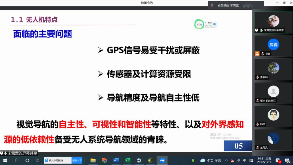 从1月12日-14日,青年教师李前进行了题为“Network Disintegration via Metaheuristic Algorithm”的线上报告,针对复杂网络瓦解问题如何识别网络中关键节点的最优集进行介绍,并给出一种基于精英主义的多目标进化算法,能够以最小成本瓦解网络;青年教师杨钊带来了题为“Spatial and Spatio-Temporal Data Mining”的学术报告,介绍了一套基于大数据、云计算和人工智能构建的计算架构,以处理和分析大尺度地理空间和环境数据;青年教师宋霄罡作了题为“微小型无人机高精度自主导航算法研究”线上学术报告,针对GPS拒止和计算资源有限条件下微小型无人机自主导航问题,介绍了视觉SLAM相关的快速均匀特征点匹配、轻量级语义分割、单目深度估计、单目相机位姿估计、图像超分辨率重建等方法,并给出两个工程应用实例。