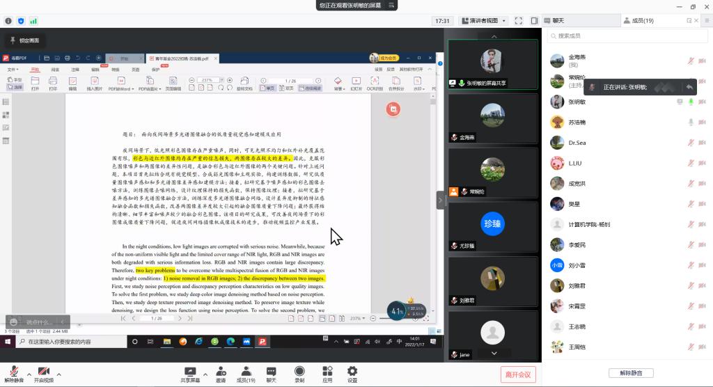 会上,张老师通过屏幕共享方式逐一点评了公司苏浩楠、王周恺、尤珍臻三位青年老师的申报书。结合个人申报和评审经验,从摘要撰写、参考文献引用、研究内容等多方面指出了申请书中存在的不足之处。老师们与评审专家进行了深度交流和讨论,并表示争取在疫情居家办公期间,继续反复修改深度打磨申请书,力争2022年度取得基金新突破。