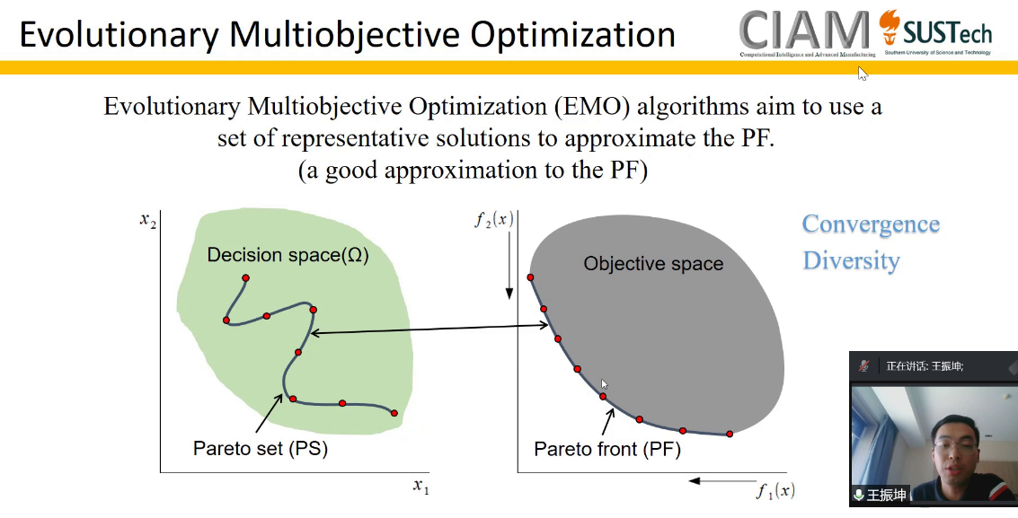 会上,王振坤首先介绍了多目标优化概念及其发展历程,接着系统地MOEA/D算法的相关研究工作。针对不平衡多目标问题,王老师详尽地介绍了自己和导师共同提出的MOEA/D-GR算法:针对当前DTLZ函数容易求解的问题,王老师详细介绍了自己构造的测试函数,并提出各种松弛技术来求解此类问题,获得了满意的效果;最后王老师与大家分享了进化多目标算法在华为物流中的应用问题。