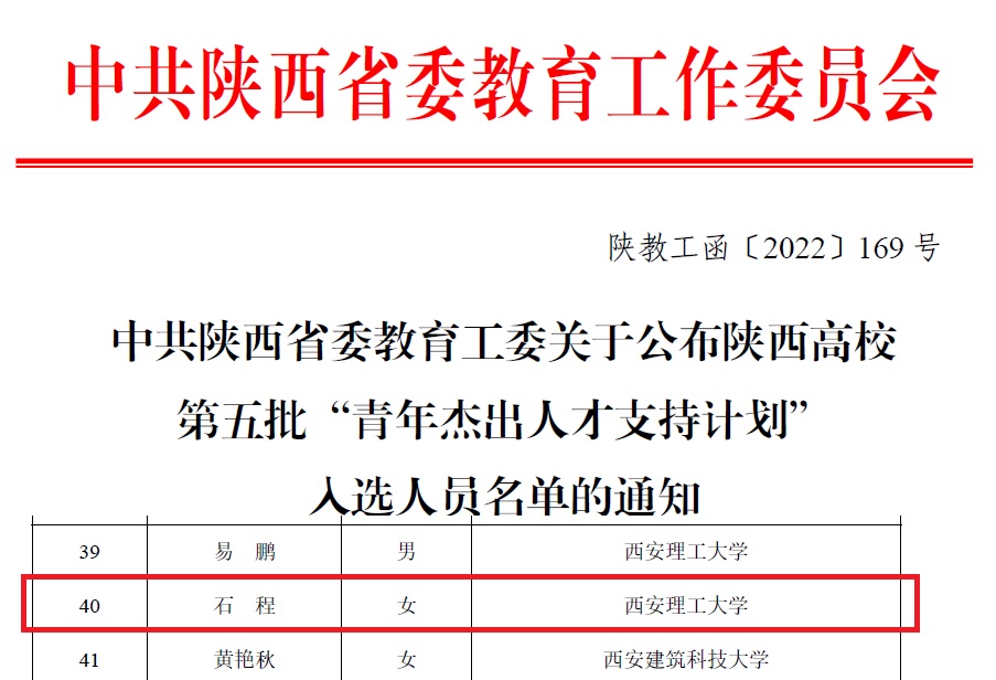 近日,中共陕西省委教育工委公布了陕西高校第五批“青年杰出人才支持计划”入选人员名单,陕教工函〔2022〕169 号,公司石程博士入选。这也是公司首位入选“青年杰出人才支持计划”的青年教师。