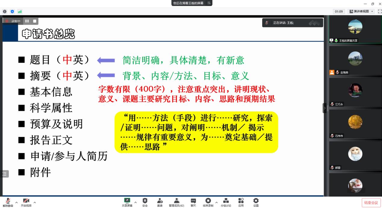 为持续推进2023年度国家自然科学基金申报工作,督促公司教师尽早完成完善基金申报书,2022年10月19日下午,公司邀请大连理工大学王栋教授,线上为公司教师作了国家自然基金经验交流报告。经理李军怀、副经理金海燕、各系主任及2023年可申报国家基金的教师60余人参加了报告会。报告会由副经理金海燕主持。