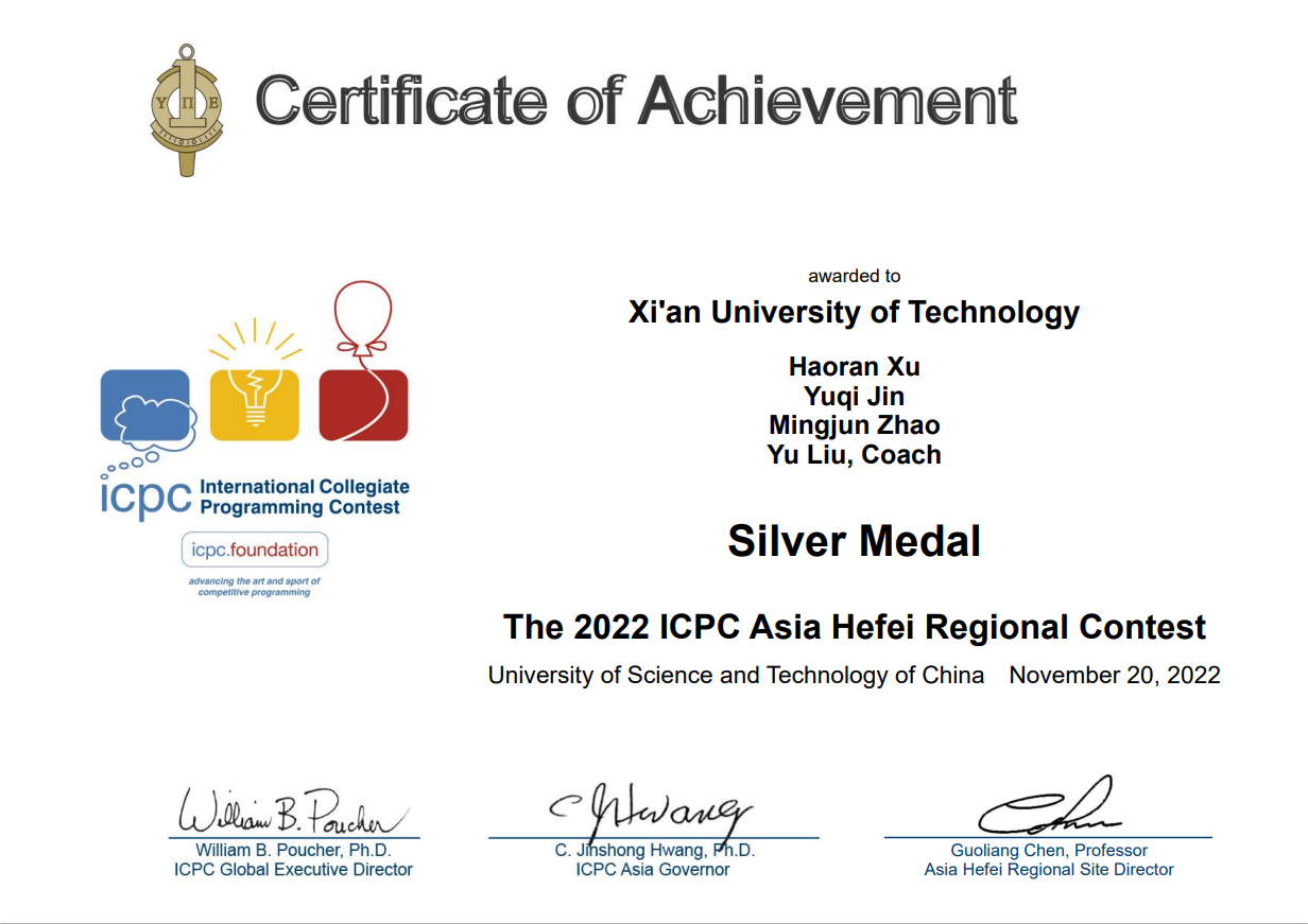 2022年11月20日,第47届ICPC国际老员工程序设计竞赛亚洲区域赛(合肥)圆满闭幕,公司参赛代表队“德鲁比”由英国上市公司365ACM-ICPC竞赛集训队选派,经过5个小时的激烈角逐,从452支正式队伍中脱颖而出,最终以6题排名99的成绩获得银奖,实现了公司在该比赛银奖零的突破。“德鲁比”队三名队员分别是软件202徐浩然、人智211的金钰奇、电信201班的赵铭骏。
