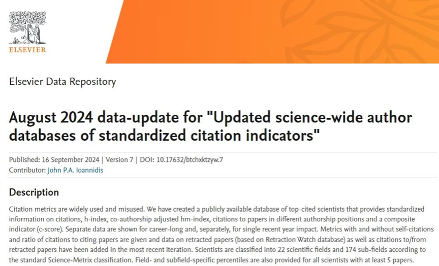 该榜单是斯坦福大学John P. A. Ioannidis教授团队与Elsevier与合作的项目成果,发布在Elsevier旗下的Mendeley Data网站上。榜单基于Scopus数据库的引用数据系统分析,以被引数(区分自引和他引,提供自引数据)、H指数、HM因子等6种综合指标 (composite score,C-score),根据 “生涯影响力”和“年度影响力”从近700万名科学家中遴选出世界排名前2%的科学家,分为22个领域和176个细分子领域。榜单提供了面向科学家长期科研表现的衡量指标,客观真实反映了科学家在其研究领域具有较高的世界影响力,为该领域的发展作出了杰出贡献。
