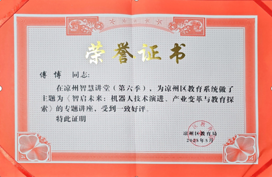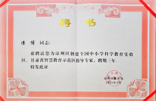 活动结束后,凉州区教育局领导为傅博老师颁发了荣誉证书,并正式聘请傅老师担任凉州区创建全国中小学科学教育实验区、甘肃省智慧教育示范区指导专家。这一荣誉不仅是对傅博老师个人专业能力和科普贡献的高度认可,也将为凉州区中小学科学教育的发展提供有力的智力支持。此次活动还吸引了当地媒体的积极报道,进一步扩大了活动的影响力。